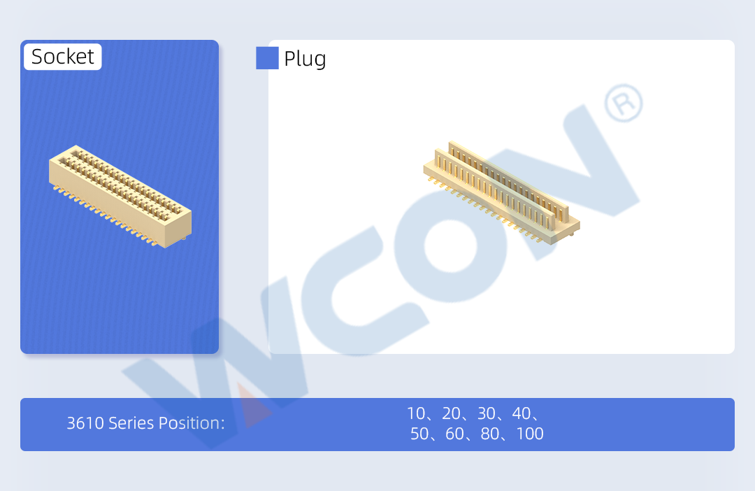 As industrial equipment continues to evolve toward higher density and modularization, greater demands are placed on the spatial adaptability and signal stability of board-to-board connectors. Wcon electronics' 3610 series is a vertical board-to-board connector with a 0.80mm pitch. Its dual-groove design enhances connection stability and reliability, making it ideal for a wide range of compact applications.
